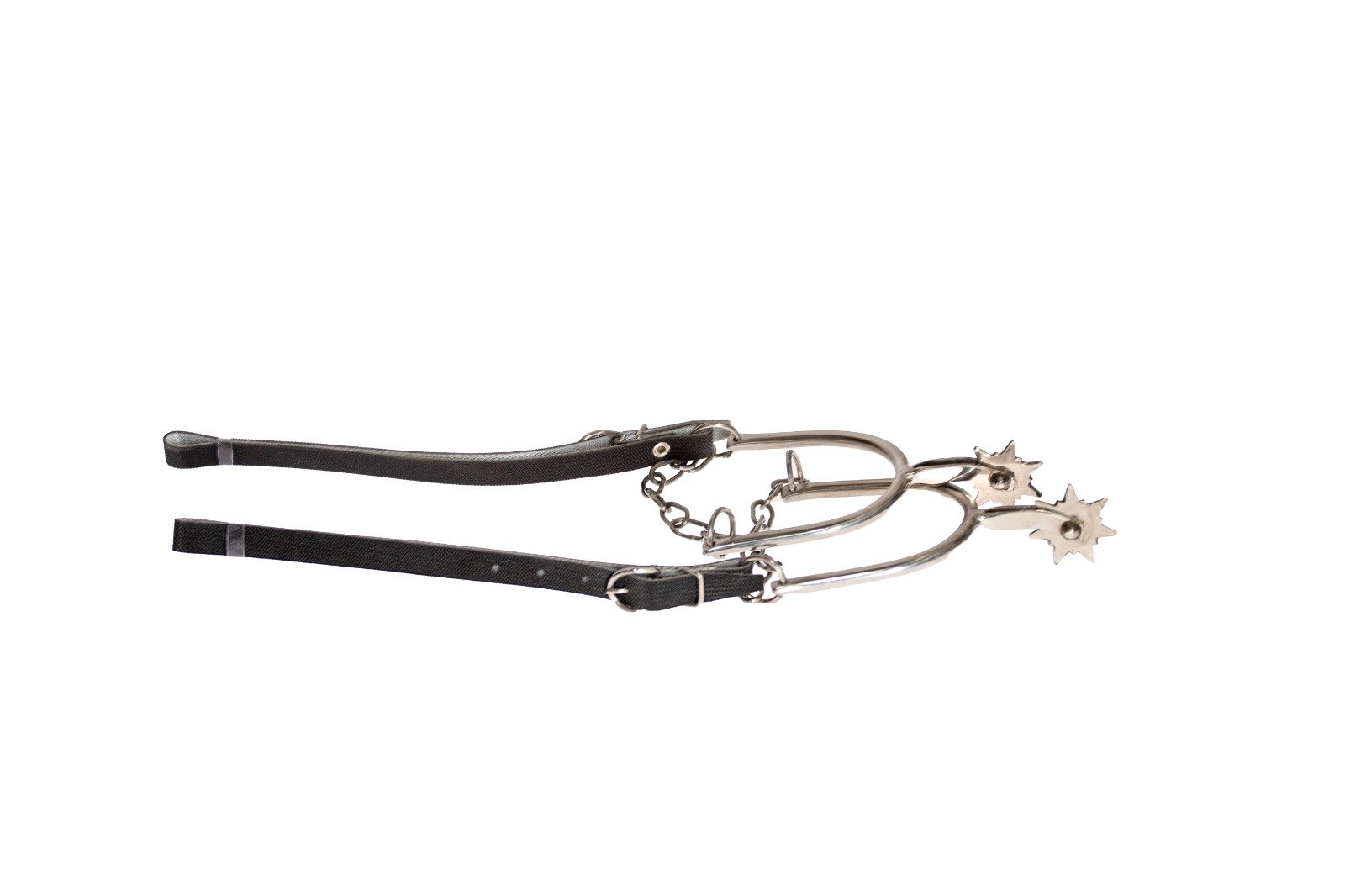Espora para vaquejada fabricada em aço inoxidável maciço e correias em couro.